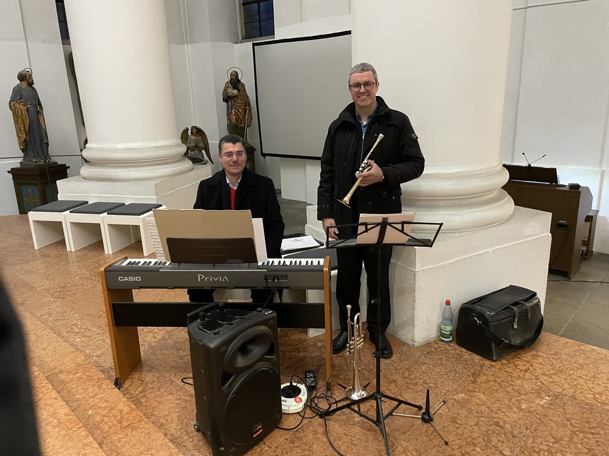 Die Feier wurde gestaltet von Jürgen Weyer an der Trompete sowie unserem Kantor Matthias Braun am Klavier. Trompete und Klavier ergänzten sich klanglich und verliehen dem Gottesdienst eine festliche Atmosphäre.