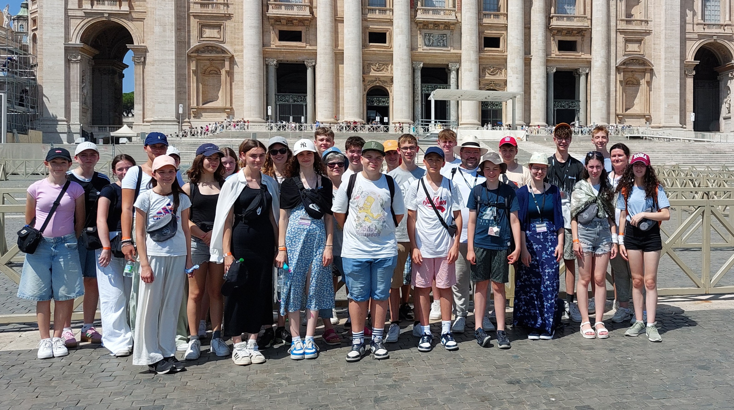 Zu dieser Großveranstaltung hatten sich 70.000 Ministranten aus 19 Nationen angemeldet, darunter 1.600 aus dem Bistum Würzburg. In Würzburg fand der Aussendungsgottesdienst im Dom statt, um den Segen von Bischof Franz Jung zu empfangen, bevor wir uns zur Fahrt über Nacht nach Rom aufmachten. In Rom angekommen, wurde zunächst unser Hotel bezogen, um sich von der 17-stündigen Busfahrt zu erholen. Mit der Metro ging es am Nachmittag in das Zentrum der Ewigen Stadt - denn es stand eine Überraschung an. Am Pantheon trafen wir uns mit unserem Generalvikar Dr. Jürgen Vorndran, welcher uns die bekannten Basiliken wie Santa Maria Sopra Minerva (Grab der Hl. Katharina v. Siena) und Sant` Ignazio di Loyola (wo er und Bischof Franz die Priesterweihe empfingen) zeigte und erklärte. Wir erfuhren Wissenswertes über die Geschichte Roms und über die vielen Trinkbrunnen der Stadt, welche wir bei den hohen Temperaturen (40 Grad) regelmäßig aufsuchten. Im Anschluss an diese kurzweilige Stadtführung lud uns Dr. Vorndran ein auf ein leckeres Eis, welches wir in der bekanntesten Eisdiele Roms, bei Giolitti, bekamen. Der Dienstag begann mit einem Spaziergang zum Kolosseum, über das Forum Romanum bis zum Kapitol, dem Rathaus der Stadt mit der Säule der säugenden Wölfin mit Remulus und Remus. Im Anschluss besuchten wir die Kirche Santa Maria in Aracoeli welche das bekannte Jesuskind (Santo Bambino Gesu) beherbergt und von den Römern verehrt wird. Der Nachmittag und Abend stand ganz im Zeichen der Papstaudienz. Trotz Schwierigkeiten an den Zugängen zum Petersplatz und den hohen Temperaturen hatten wir einen guten Blick auf das offene Papamobil um Papst Franziskus zu sehen. Die Papstaudienz stand ganz unter dem Wallfahrtsmotto „Mit Dir“. Am Mittwoch stand Erholung auf dem Programm. In Kleingruppen wurde die Stadt erkundet, leckere Pasta und Pizza gegessen oder im Naherholungsgebiet Villa Borghese Ruderboot gefahren. Der Vatikan wurde am Donnerstag besichtigt. Nach langem Anstehen kamen wir in den Petersdom um die prachtvolle Basilika zu bestaunen. Die Kuppel mit ihren über 500 Stufen wurde erklommen, um den atemberaubenden Blick über Rom zu genießen. Am Nachmittag feierten wir unseren großen diözesanen Gottesdienst mit Bischof Franz Jung gemeinsam mit dem Erzbistum Bamberg und Erzbischof Herwig Gössl im Lateran, der ursprünglichen Papstkirche vor dem Petersdom. Mit 3000 Ministranten war dieser Gottesdienst ein besonderes Gemeinschaftsgefühl. Am Freitag fand ebenfalls ein besonderer Gottesdienst auf dem Aventin in San Anselmo mit Bischof Franz statt. Es war unser Regionengottesdienst. Sprich die Region Main-Rhön. Zum Abschluss dieses Gottesdienstes wurde zum Wallfahrtslied „Mit Dir“ getanzt in ausgelassener Stimmung. Der Blick durch das bekannte Schlüsselloch, Besuch der Kirche Santa Sabina, Orangengarten und Rosengarten rundeten den offiziellen Teil ab. Der Rest des Tages stand zur freien Verfügung, wo jeder nochmal Pizza, Pasta und Gelato genießen konnte bevor es am Abend wieder mit dem Bus Richtung Deutschland ging. Am Samstag, 03. August kamen wir wieder wohlbehalten in Bad Neustadt an mit wunderbaren Eindrücken, neuen Kontakten und das Gefühl von Dolce Vita in Italien.