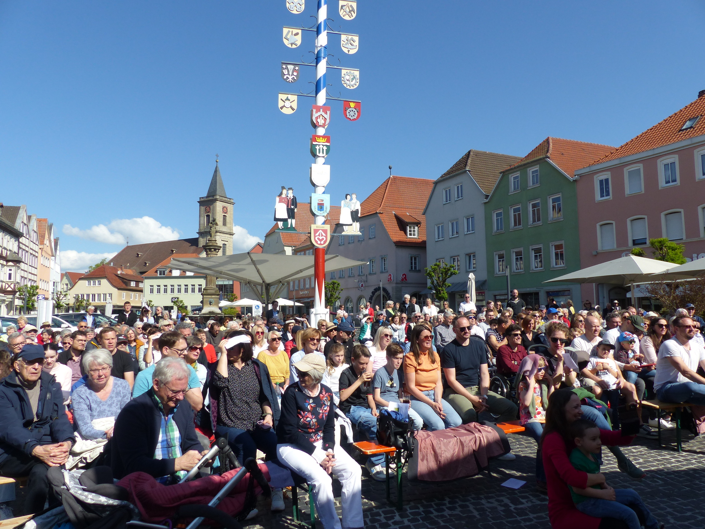 Strahlender Sonnenschein hatte am Himmelfahrtstag zahlreiche Familien auf den Bad Neustädter Marktplatz gelockt, wo sich der traditionelle ökumenische Familiengottesdienst heuer mit den vier Himmelsrichtungen beschäftigte. Aus Ost und West, aus Süd und Nord hatten sich die Menschen auf den Weg in die Innenstadt gemacht, um gemeinsam mit den Kinderchören der evangelischen Kirchengemeinde unter Leitung der Kirchenmusikdirektoren Karin und Thomas Riegler zu feiern.