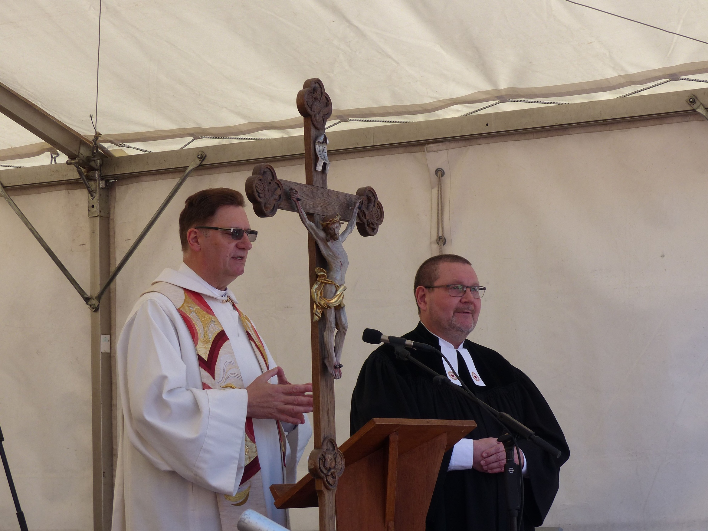 Anhand dieses Votums und umrahmt von schwungvollen Liedern der Kinderchöre und der Gemeinde entfalteten Dekan Andreas Krefft und Dekan Uwe Rasp Gottes Verheißung für alle Menschen auf der Erde: Wo Menschen aus verschiedenen Himmelsrichtungen zusammenkommen, aus verschiedenen Lebenssituationen, mit verschiedenen Gaben und Fähigkeiten, Große und Kleine, da ist Gottes Reich schon heute spürbar. Diese Gemeinschaft macht Mut, sich einzusetzen für das Recht der anderen, Mut, den Frieden, den uns Christus bringt, weiterzugeben vor Ort und hinaus in die Welt.