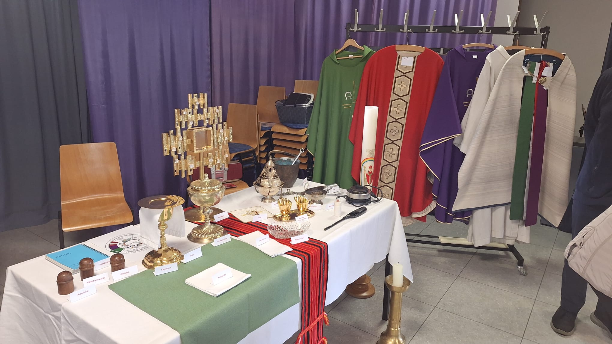Aber Bibelkreise, die Gruppe „Helfende Hände“, die Kirchenverwaltungen, Kommunionhelfer und Lektoren, Kolpingfamilien, Ministrantinnen und Ministranten, alle, die für die Musik zuständig sind, d.h. Organisten, Chöre, Musikgruppen und Blaskapellen, die Pfadfinder und fünf verschiedene Seniorengruppen stellten sich vor. Am meisten Blicke zog vielleicht – neben den Ministranten – der Stand der Küsterinnen und Küster auf sich: mit goldenen Altargeräten, farbigen Gewändern usw.