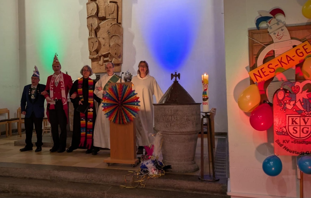 Am Mittwoch, den 11. Februar startete um 18.00Uhr der 10. Ökumenische Narrengottesdienst in Bad Neustadt. Dieses mal fand er in der Evangelischen Christuskirche statt. Zu den närrischen Klängen des Musikverein Gartenstadt zogen Pfarrerin Gerhild Ehrmann von der Evangelischen Kirchengemeinde, und Alexandra Andrea Ortloff mit Diakon Wolfgang Dömling von der katholischen Pfarreiengemeischaft Bad Neustadt, Ronald Weisenseel vom Karnevalsverein Stadtgarde und Alexander Kröckel von der NES- KA-GE in das bunt geschmückte Gotteshaus ein. Auch viele Kirchenbesucher hatten ihren Faschingshut oder die Federboa aus dem Schrank geholt und freuten sich mit vielen Abordnungen befreundeter Faschingsvereine auf den Gottesdienst. Nach der liturgischen Eröffnung brachten die Gardemädels- und Jungs des KVSG, Schwung in die Gänge und tanzten ihren diesjährigen Gemeinschaftstanz. Beim Hallelu- Halleluja wurde es dann sportlich für die Gottesdienstbesucher selbst, denn bei jedem „Hallelu“ mussten die Frauen, und beim „preiset den Herrn“ die Männer aufstehen, was bei vier Strophen ganz schön in die Beine ging. In einer nachdenklichen Geschichte ging es darum, dass es neben den Dingen die man sieht, und die man zählen kann auch ganz viele Sachen gibt, die nicht so leicht zu zählen sind, wie zum Beispiel Zuneigung und gemeinsames Lachen. Dort entsteht dann jedoch wieder Gemeinschaft auf die man zählen kann, in der man sich wohl fühlt, und in der man willkommen ist. Außerdem können wir auch noch auf jemanden zählen, den wir zwar nicht sehen, den wir aber spüren und mit dem wir reden können.