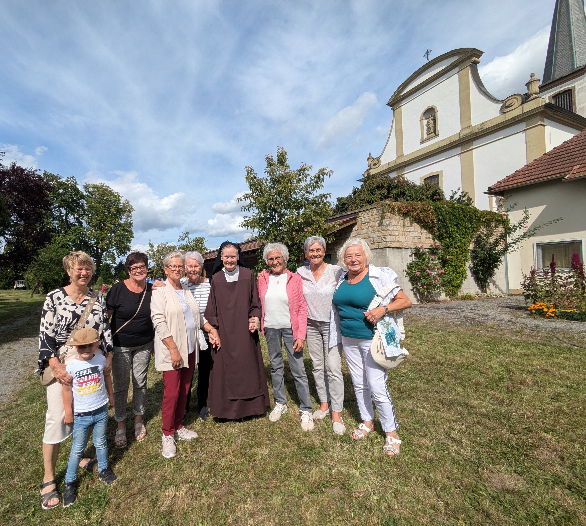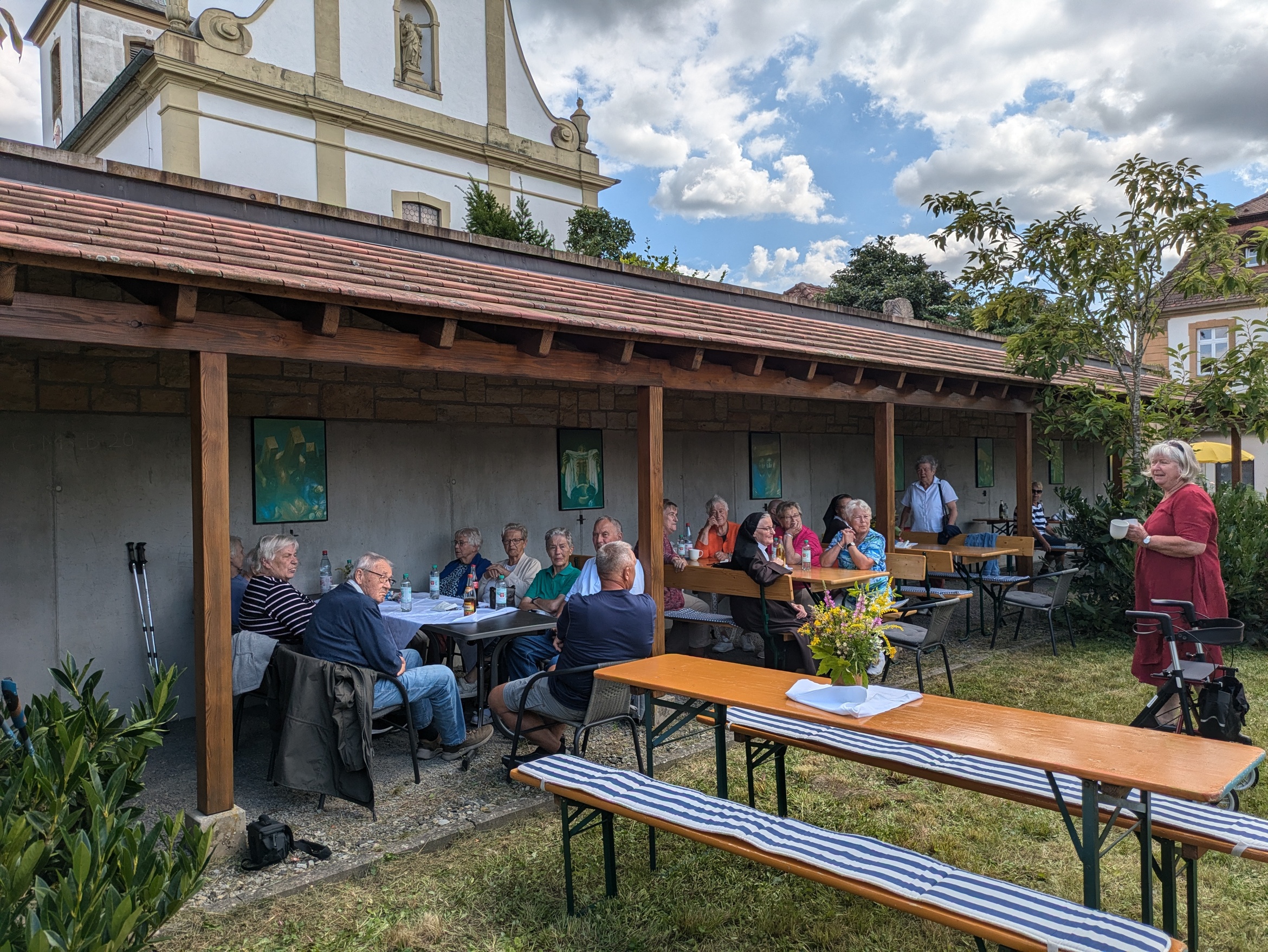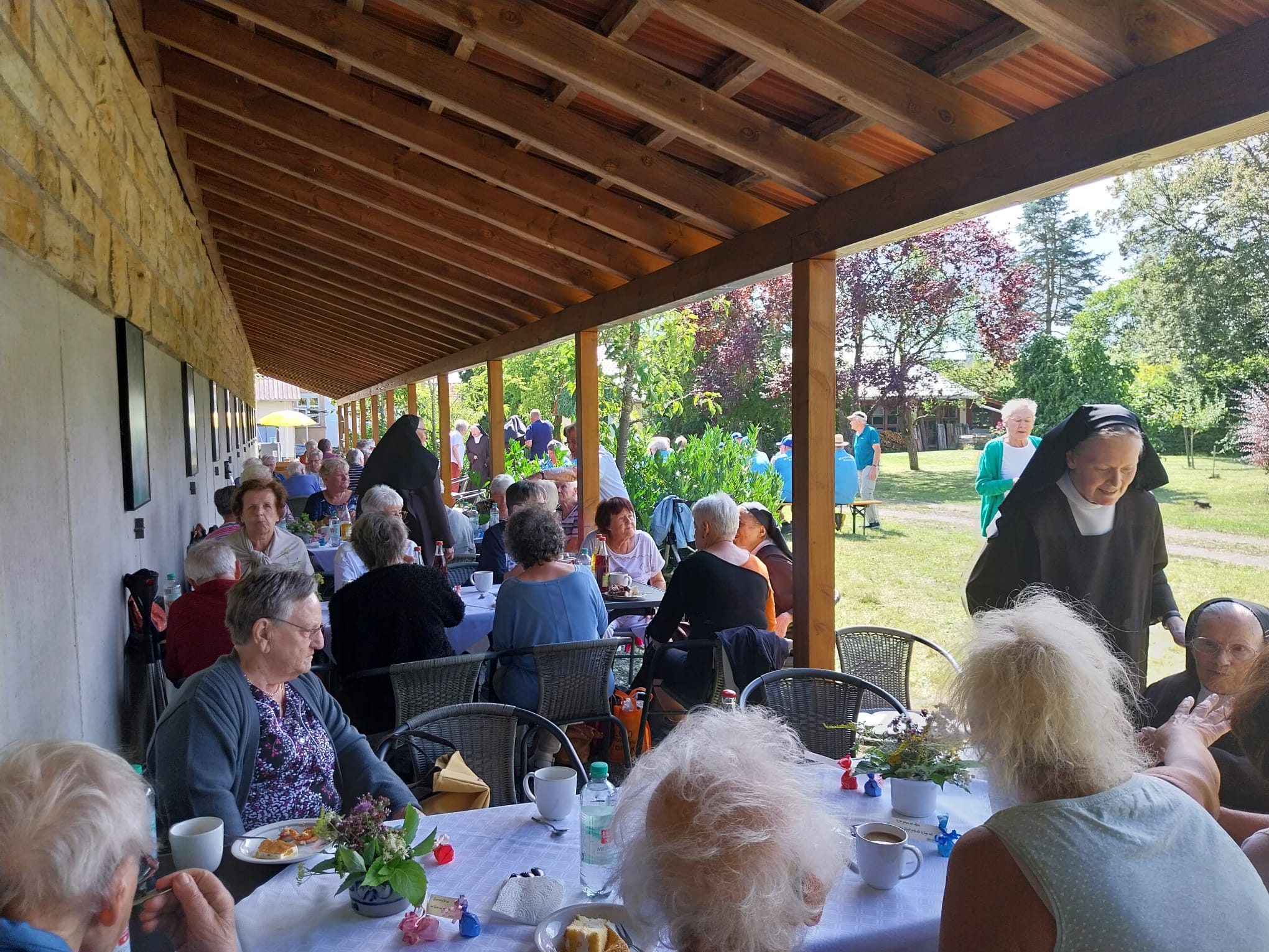 Viele fleißige Helferinnen des Senioren- und Gemeindeteams unter der Führung von Anita Laudenbach haben für ausreichend Verpflegung gesorgt. Für viele Seniorinnen und Senioren war es das erste mal, hinter die Klostermauern zu blicken und das Areal des riesigen Klostergartens mal zu erleben. Daher kamen auch deutlich mehr Teilnehmer als gewöhnlich. Neben den Geistlichkeiten Thomas Keßler und Bernold Rauch, ließen sich auch die Wanderfreunde von Rödelmaier diese Möglichkeit nicht entgehen. Es war einmalig zu erleben, welche Freude beim Austausch mit den Schwestern untereinander verbreitet wurde. Viele bedauerten sehr, dass gemeinsame Begegnungen mit den Schwestern erst seit einigen Jahren möglich sind. So wurden höchst interessante Erlebnisse und Geschichten von früher ausgetauscht. Nachdem die Schwestern ein Danklied und das „Fränkische Ave Maria“ zwei Lieder zum Besten gegeben haben wurde gemeinsam das Rödelmairer Lied mit der Wandergruppe geschmettert. Selig und Zufrieden verabschiedeten sich die Seniorinnen und Senioren von den Schwestern und bedauerten, dass man den Seniorentag nicht schon öfter in der Vergangenheit in dem Rahmen abgehalten hat. Zukünftig ist es leider nicht mehr möglich, da die Schwestern Ende November das Kloster Richtung Eifel verlassen werden. Alle waren sich einig, dass dies ein gelungenes Treffen war.