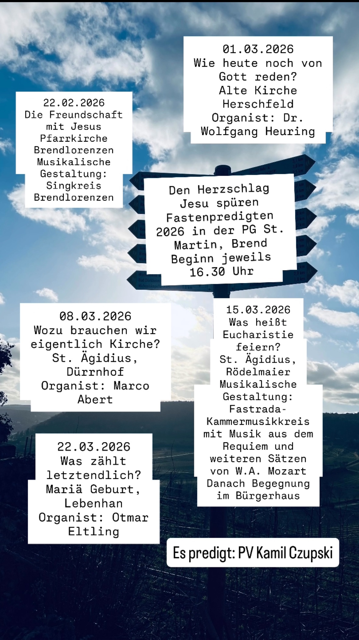 Wieder Fastenpredigten in der Pfarreiengemeinschaft St. Martin. An allen Fastensonntagen lädt die Pfarreiengemeinschaft St. Martin jeweils um 16:30 Uhr zu zusätzlichen besonderen Gottesdiensten ein. Pfarrvikar Kamil Czupski predigt dabei  jeweils zu einem Aspekt des Oberthemas „Den Herzschlag Jesu spüren“.