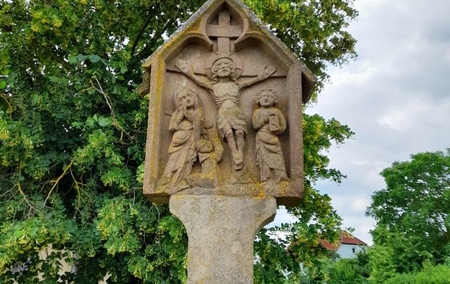 Die Kunstdenkmäler des Königreichs Bayern von 1914 registrieren zu diesem Denkmal: Der Bildstock steht zwischen Strahlungen und Bildhausen auf viereckigem Pfeiler Doppelrelief der Kreuzigung, im Giebelbogen geschlossen. Auf der einen Seite (heute gänzlich verwittert) lautet die Inschrift: "Ich bitte Dich, Wanderer, hemme den Schritt. Siehe, hier das edle Siegeszeichen des gekreuzigten Christus. Einst wird er am Kreuze sprechen: Hierher, Ihr Verdammten, dorthin, Ihr Gesegneten! Bete ihn niedergebeugt an, Du wirst selig werden. Geh weiter, Wanderer."